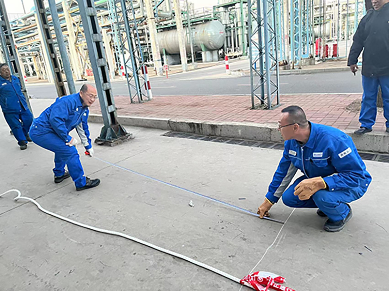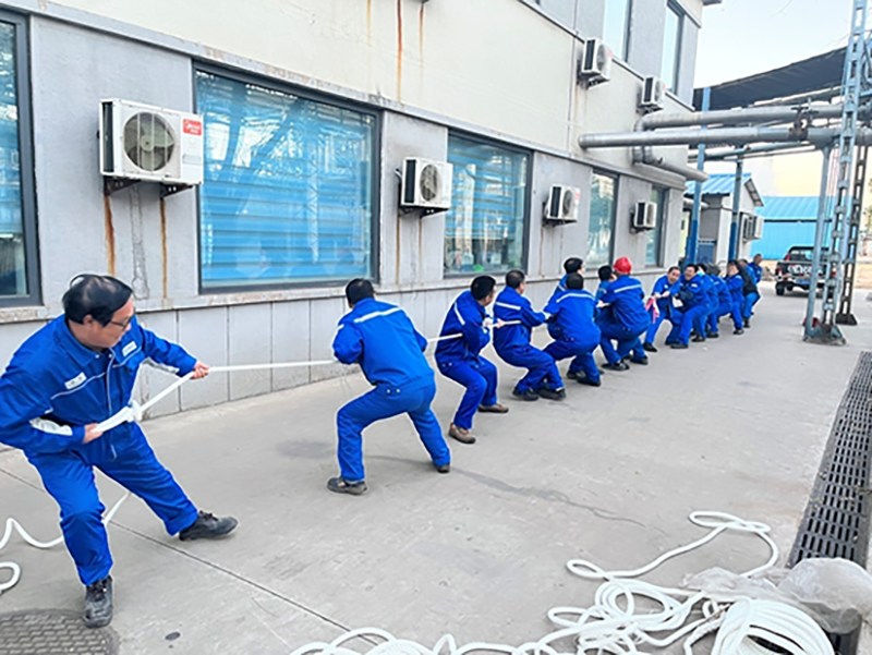 賽前,精聯(lián)公司黨支部書記兼總經(jīng)理宋連軍對(duì)本場(chǎng)賽事提出要求:非常時(shí)期,必須把安全放在首位。心中有了安全這根紅線,在賽事的準(zhǔn)備過(guò)程中加倍用心。首先,繩索選擇結(jié)實(shí)耐用的尼龍繩。其次,參賽班員穿好防砸鞋防滑并防止崴腳,戴好手套防止手被磨破。最后,場(chǎng)地選擇辦公樓前空地,遠(yuǎn)離道路。為體現(xiàn)比賽的公平性,精聯(lián)公司副總經(jīng)理徐巖基拿出卷尺丈量中心線;為鼓舞士氣,駐廠的管理人員也分別加入兩個(gè)班組進(jìn)行助力。
